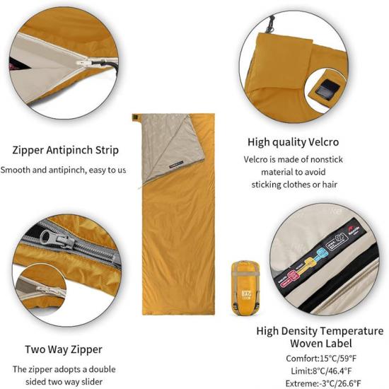 Der Stoff des Schlafsacks wurde speziell behandelt, um Feuchtigkeitsbeständigkeit, Windbeständigkeit und Wärme zu gewährleisten und sich an eine Vielzahl rauer Umgebungen anzupassen.