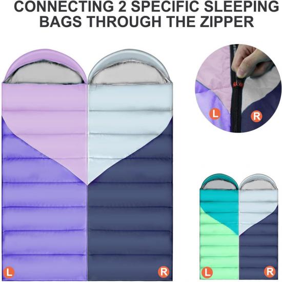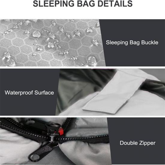 Der 1,8 kg schwere Schlafsack aus Polyester verfügt über hochwertige doppelseitige Reißverschlüsse, die nicht hängen bleiben, und die Füße haben verstellbare Reißverschlüsse, um die Menge an warmer oder kalter Luft zu regulieren, die in den Schlafsack eindringt oder ihn verlässt. Dadurch kann es an individuelle Bedürfnisse unterschiedlicher Umgebungen und Temperaturen angepasst werden. Sie können den Schlafsack sogar vollständig geöffnet als Decke verwenden, was seine Vielseitigkeit und Zweckmäßigkeit erheblich erhöht.