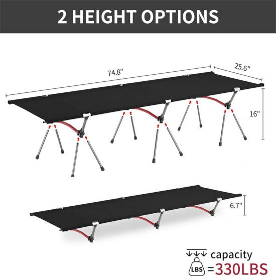 Ein besonderes Merkmal dieses komfortablen Klappbetts für Katastrophenhilfe sind seine zwei Höhenoptionen. Die niedrige Einstellung eignet sich für den Einsatz in Zelten oder auf festem Boden mit einer Höhe von 17 cm, während die hohe Einstellung mit einer Höhe von 40 cm perfekt für Gras, Schlamm und nassen Boden geeignet ist. Dieses Design bietet dem Benutzer mehr Flexibilität in unterschiedlichem Gelände und unter unterschiedlichen Bedingungen.