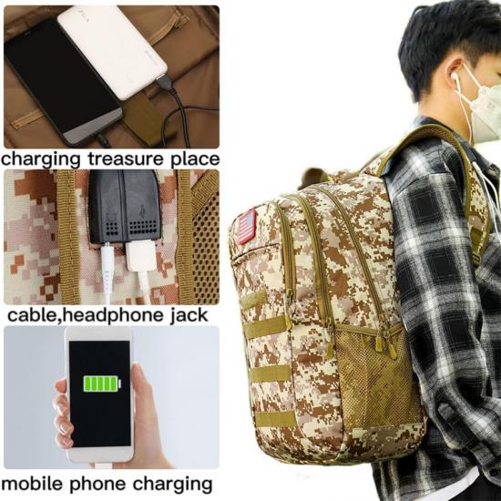 Der robuste Rucksackgurt für militärische Katastrophenhilfe ist mit einem Dual-USB-Anschluss und einem integrierten Ladekabel ausgestattet, sodass Sie Ihr Mobiltelefon jederzeit bequem aufladen können, ohne sich um Stromausfälle sorgen zu müssen. Kopfhörerbuchse und USB-Anschluss sind nebeneinander angeordnet, sodass Sie beim Laden Musik genießen können.
