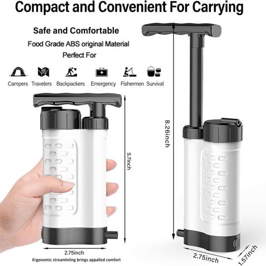 Dieser 14,4 x 7,8 cm große Wasserreiniger für die Katastrophenhilfe verfügt über eine hervorragende Filterleistung, die Verunreinigungen und Schadstoffe vollständig aus Ihrer Wasserquelle entfernt und so sicherstellt, dass jeder Schluck Wasser, das Sie trinken, rein ist. Er hat außerdem eine sehr schnelle Durchflussrate und produziert 1500 ml (1,5 Liter) reines Wasser pro Minute, sodass Sie bei Outdoor-Aktivitäten nicht zu lange warten müssen.