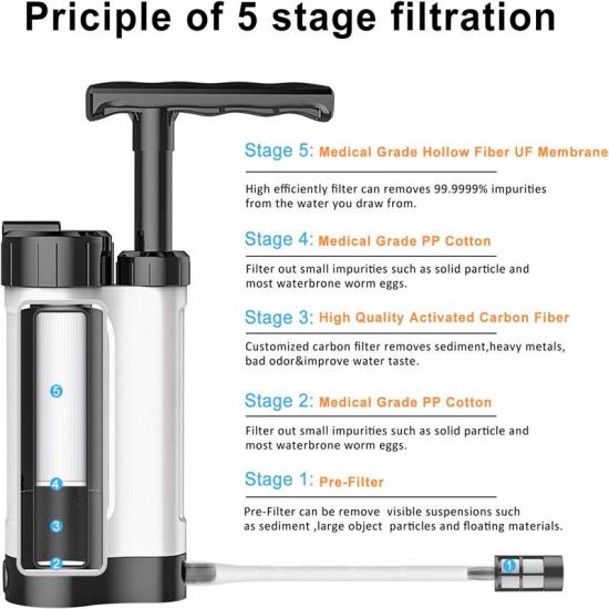 Das 8,3 x 1,6 Zoll große Kernfiltersystem des Civil Disaster Relief Water Purifier besteht aus einer medizinischen Hohlfaser-Ultrafiltrationsmembran und PP-Baumwolle. Diese arbeiten zusammen, um 99,9999 % Chlor, Schwermetalle, chemische Verunreinigungen, Sedimente und andere Partikel effektiv aus dem Wasser zu entfernen. Um die Filterwirkung weiter zu verbessern, haben wir zusätzlich hochwertige Aktivkohle aus Kokosnussschalen hinzugefügt. Diese absorbiert und entfernt Gerüche und Schadstoffe aus dem Wasser und sorgt so für reines und gesundes Trinkwasser.