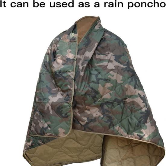 Bei diesem Produkt handelt es sich um eine wasserdichte, warme Decke mit 210T Ripstop-Material und besprühter Baumwolle, die innen mit besprühter Baumwolle gefüllt ist. Sie verhindert, dass Wasser in das Poncho-Fach eindringt, und hält Sie so warm und bequem.