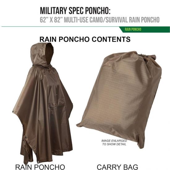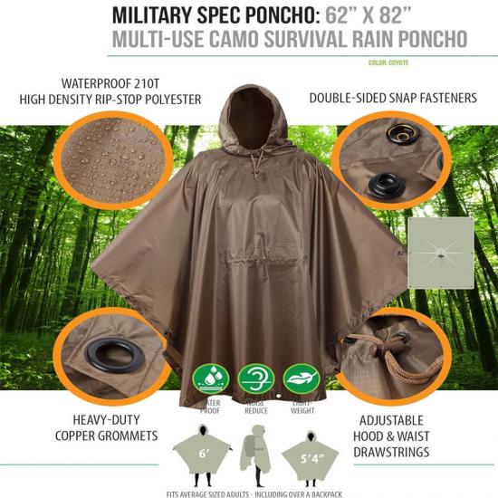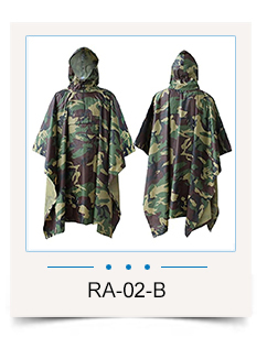 Der wasserdichte Poncho-Liner bietet trockenen Schutz vor schlechtem Wetter in Katastrophenfällen und bietet denjenigen, die sich in einer Notüberlebenssituation befinden müssen, verschiedene Möglichkeiten, sich vor der Außenumgebung zu schützen und Komfort zu bieten. Beim Militär kann der Mehrzweckponcho als Ausrüstungsgegenstand für verdeckte taktische Operationen verwendet werden, da er Reibung und Lärm reduziert.