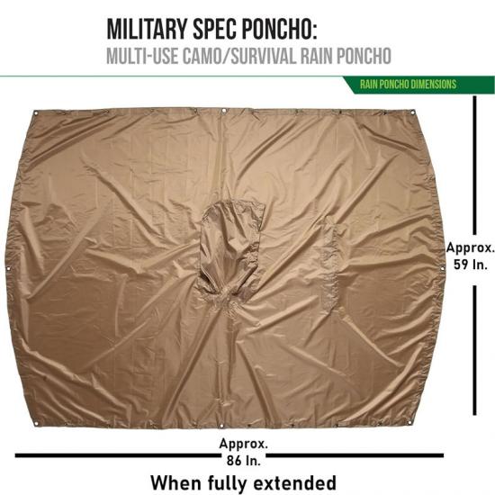 Der Poncho-Liner mit einer Wasserdichtigkeit von 3000 mm besteht aus hochdichtem Ripstop-Polyester und polyurethanbeschichtetem Gewebe mit einer hervorragenden Wasserdichtigkeit von 3000 mm. Der Poncho ist etwa 59 Zoll breit und 86 Zoll lang und damit breit genug, um größere Rucksäcke aufzunehmen. Die Tragetasche ist ungefähr 6 x 8 x 3 Zoll groß. Das Gesamtgewicht beträgt 18 Unzen und die verstellbare Kapuze mit Kordelzug sorgt für einen sicheren, bequemen Sitz. Der Poncho verfügt außerdem über einen verstellbaren Kordelzug mit einer Kapuzenöffnung von 9 Zoll Durchmesser, sodass der Benutzer ihn bei Bedarf leicht anpassen kann.