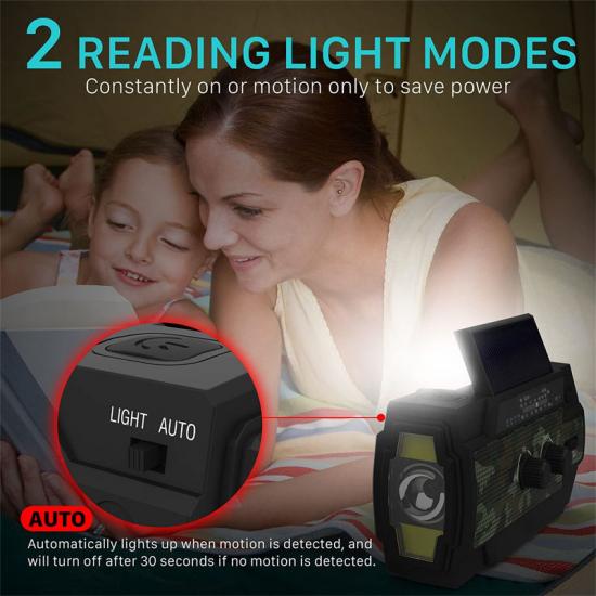 Dieses Notfall-Produktradio mit 4 LED-Leseleuchten ist mehr als nur ein Kommunikationsmittel. Es bietet zwei Lichtoptionen: 4 LED-Leseleuchten und einen 1-W-Taschenlampenmodus. Diese Lichtquellen sorgen bei Stromausfall oder -unterbrechung für sofortige Beleuchtung und sorgen so für Ihre Sicherheit und die Ihrer Familie.