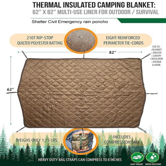 FUNKTION: Der Regenponcho-Innenbezug aus Polyester- und Baumwollgewebe bietet nicht nur Wärme und Schutz vor den meisten Wetterelementen und Temperaturen, sondern kann auch als schnell trocknendes temporäres Überlebenszelt, Markise, Hängemattenisolierung, Kissen, Zelttrennwand, Sichtschutz, Notfall-Tragewerkzeug, Katastrophenhilfe, versteckter Bunker, Tragetasche, Schlafsack oder Zeltisolierung verwendet werden.