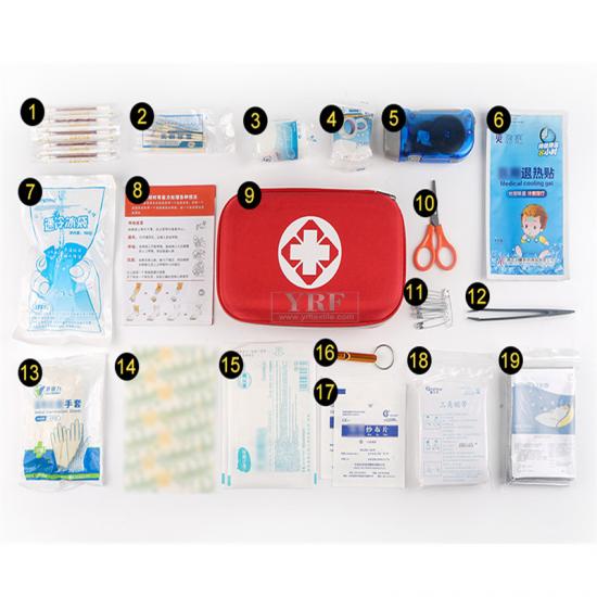 Feuchttücher * 10 Stück/Beutel, Maske * 5, Dreiecksverband * 1, Jodophor-Baumwolltuch * 10, Alkoholtabletten * 20, Antipyretikum-Pflaster * 1, elastischer dünner PBT-Streifen * 1, CPR-Maske * 1, Windöl-Essenz * 1, Mullkompresse * 2, Klebeband * 1, Verbandpflaster * 12, Wattestäbchen * 1, Sicherheitsnadel * 10, Pinzette 1, Tourniquet * 1, Schere * 1, dringendes Aufklärungspaket * 1