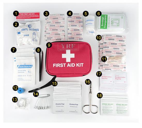 Anleitung *1, PVC-Handschuhe *1, Schmetterlingspflaster *5, Quadratisches Pflaster *5, PBT-Verband *1, Dreiecksverband *1, Mullstück *5, Pinzette *1, Erste-Hilfe-Kasten *1, Rechteckiges Pflaster *20, Wattestäbchenbeutel *1, Tourniquet *1, Vliesband *1, Sicherheitsnadel *10, Alkoholtabletten *40, Schere *1, Iodophortabletten *10, Zhiyang-Tablette *10