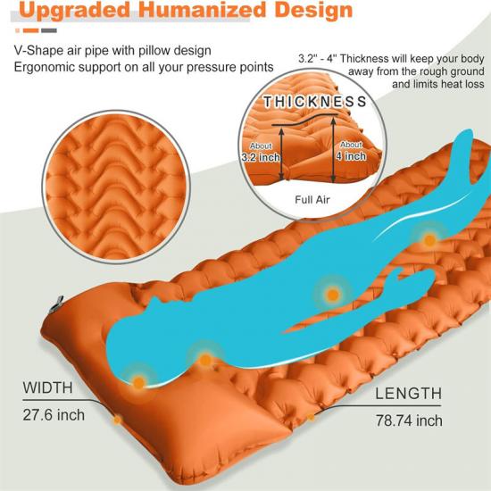 Unsere breiten und dicken aufblasbaren Schlafmatten verfügen über ein einzigartiges V-förmiges Design, ergonomisch gestaltet, um