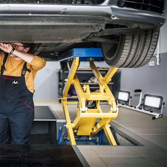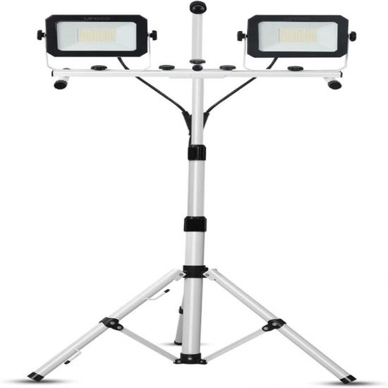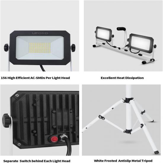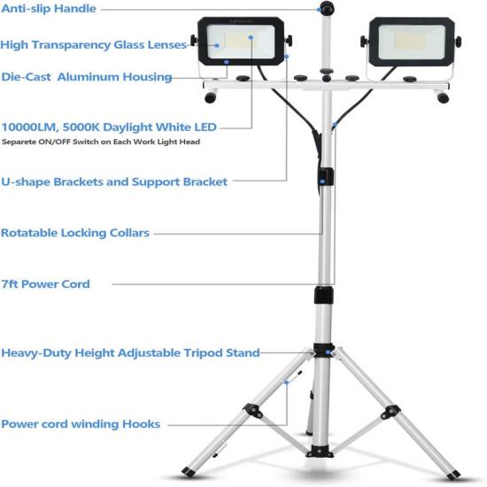 Die Notleuchte hat 5000 Lumen pro Kappe und 5000K weißes Blitzlicht. Das Teleskopstativ lässt sich von 83,8 cm bis 178,8 cm ausziehen. Jeder Kopf lässt sich horizontal um 360° schwenken und vertikal um 270° neigen, um den gewünschten Beleuchtungswinkel einzustellen. Die Doppelkopf-Arbeitsleuchte mit Griff kann für den eigenständigen Gebrauch abgenommen werden, sodass kein Stativ erforderlich ist.
