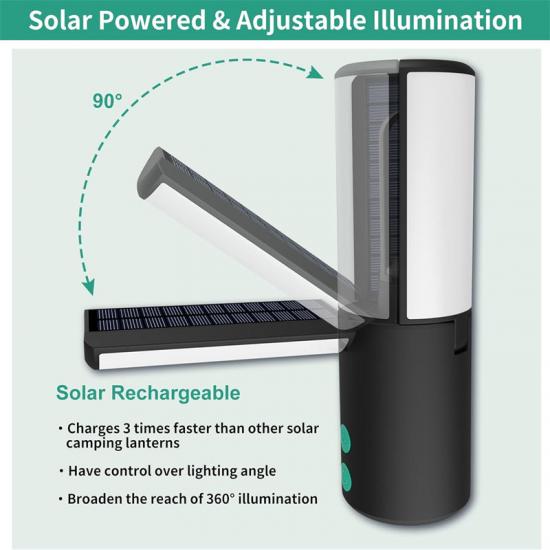 90°-Design mit drei verstellbaren Solarmodulen: Die tragbare Militär-Notleuchte ist mit 3 verstellbaren Solarmodulen ausgestattet. Sie kann nicht nur durch Solarenergie aufgeladen werden, sondern ihr verstellbares Design ermöglicht es Ihnen auch, die Abdeckung der 360°-Beleuchtung einfach zu erweitern und den Beleuchtungswinkel nach Bedarf anzupassen.