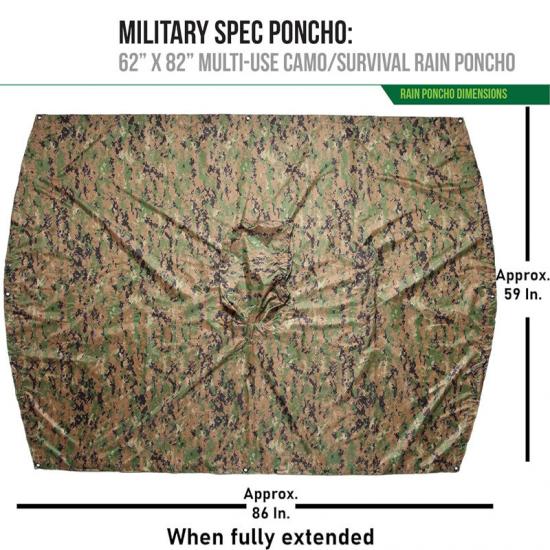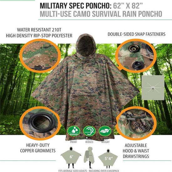 Vielseitigkeit: Die multifunktionale Regenponcho-Linie ist mit einem Taillenkordelzug ausgestattet, der zusätzliche 16 Zoll Einstellmöglichkeiten bietet. Darüber hinaus verfügt der Poncho über 8 robuste Metallösen, um das Futter für zusätzliche Isolierung zu sichern und es einfach als Kordelzugbefestigung zu verwenden. Durch seine Vielseitigkeit kann dieser Poncho an zahlreiche Einsatzszenarien angepasst werden, beispielsweise als Sonnenschirm, Überlebenszelt, Wasserauffangbehälter, Notfalltrage, Hängemattenabdeckung, Zeltteiler, Sichtschutz und versteckter Unterschlupf.