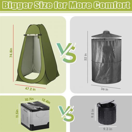 Darüber hinaus ist die Größe unseres tragbaren Polizeizelt-Sets besonders benutzerfreundlich gestaltet. Das Sichtschutzzelt misst 190 x 150 x 150 cm und wiegt nur 2,2 kg. Es bietet dem Benutzer einen geräumigen und komfortablen privaten Raum. Die Größe der Falttoilette ist sowohl praktisch als auch tragbar, sodass sie problemlos im Rucksack transportiert werden kann.