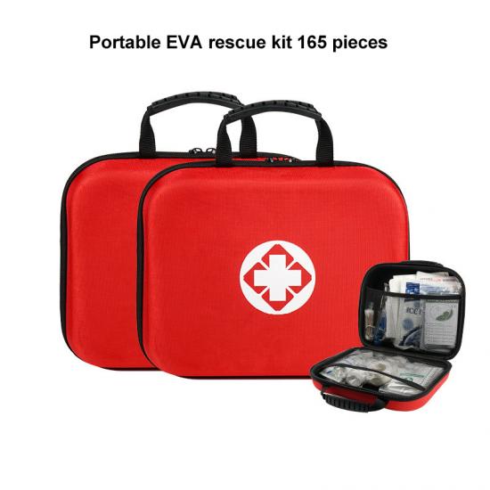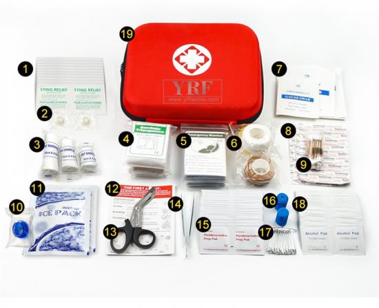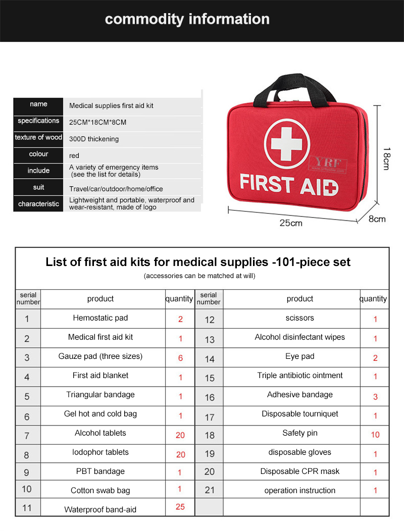Zhiyang-Tablette *20, Klebeband *2, PBT-Verband (drei Größen) *3, Dreiecksverband *2, Erste-Hilfe-Decke *2, Heftpflaster *2, Mullkompresse (drei Größen) *6, Wasserfestes Pflaster *20, Wattestäbchen *30, CPR-Abdeckung *1, Kühlakku *1, Gebrauchsanweisung *1, Schere *1, Pinzette *1, Iodophor-Tabletten *20, Einweg-Tourniquet *2, Nadel *10, Alkoholtabletten *50, Tragbares EVA-Rettungspaket *1