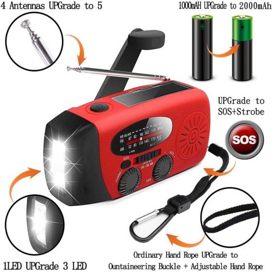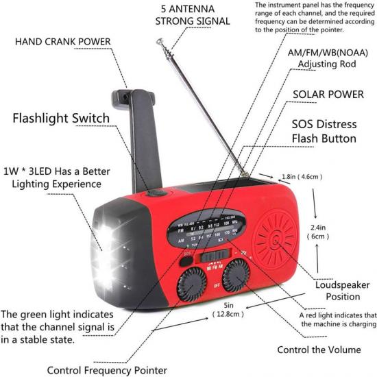 A: Dieses Engineering Radio des Roten Kreuzes kann 7 Kanäle des NOAA-Wetterradios empfangen, verfügt über 3 eingebaute LED-Notfalltaschenlampen, ein Notfall-Überlebenskit mit einem SOS+-Blitzchip, eine Solarladeanzeige und eine Kanalsignalleuchte.