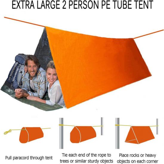 Die ausgefaltete Größe des Notfallschlafsacks für die Katastrophenhilfe beträgt 210 x 90 cm und bietet einem Erwachsenen ausreichend Platz zum bequemen Liegen. Darüber hinaus kann er im Notfall auch als Rettungsdecke für zwei Erwachsene verwendet werden und bietet Ihnen zusätzliche Wärme und Schutz. Gleichzeitig erfüllt der Schlafsack verschiedene Funktionen, z. B. als Rettungsdecke, Markise, Bodenmatte usw., um Ihren Bedürfnissen in verschiedenen Situationen gerecht zu werden.