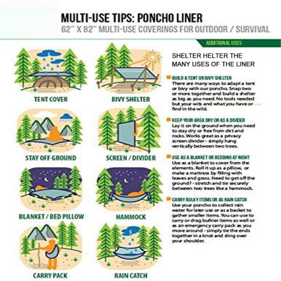Das Regenponcho-Innenfutter aus Polyester. Vielseitigkeit: Der Relief Rescue Poncho Liner ist mit einem Taillenkordelzug ausgestattet, der zusätzliche 16 Zoll Einstellmöglichkeiten bietet. Darüber hinaus verfügt der Poncho über 8 robuste Metallösen, um das Futter des Ponchos zu sichern und so für zusätzliche Isolierung zu sorgen und ihn einfach als Kordelzugbefestigung zu verwenden. Dadurch kann der Poncho nicht nur als Regenschutz, sondern auch als Sonnenschirm, Überlebenszelt, Wasserauffangbehälter, Tragerucksack, Notfalltrage, Hängemattenabdeckung, Zelttrennwand, Sichtschutz, versteckter Bunker und vieles mehr genutzt werden. Diese Vielseitigkeit macht den Mehrzweckponcho in einer Vielzahl von Szenarien nützlich.