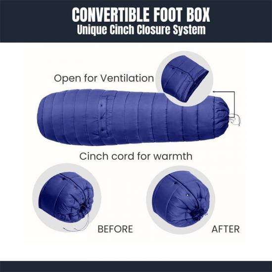 Diese Steppdecke kann mit ihrem umwandelbaren Fußpolster auch als Schlafsack verwendet werden. Es sorgt für mehr Wärme, Komfort und Effizienz, indem es Ihre Füße zusätzlich isoliert. In wärmeren Nächten haben Sie die Möglichkeit, das Fußbett für eine bessere Luftzirkulation zu öffnen. Bei kälteren Temperaturen sorgt ein festes Binden der Kordeln dann für optimale Wärme. Egal, ob es eine warme Nacht oder eine kalte Schlafumgebung ist, dieser Schlafsack von Rescue Equipment bietet Komfort und Bequemlichkeit.