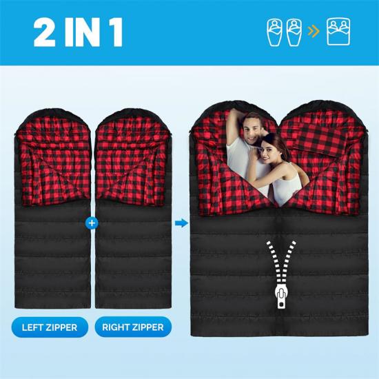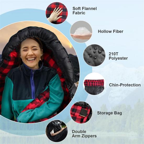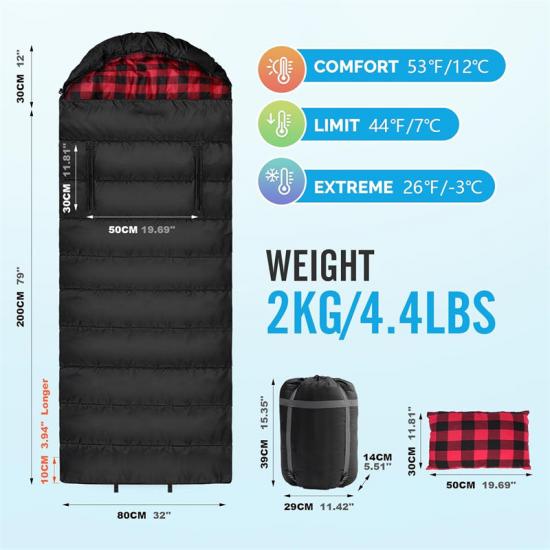 Unser Notfallschlafsack besteht aus hochwertigem, wasserdicht beschichtetem 210T Polyester-Karogewebe für die Außenschicht, das hervorragende Feuchtigkeitsbeständigkeit bietet. Der Innenstoff besteht aus einem weichen und kuscheligen Oberstoff. Der Schlafsack ist mit hohler Baumwolle gefüllt, die leicht, warm und atmungsaktiv ist.