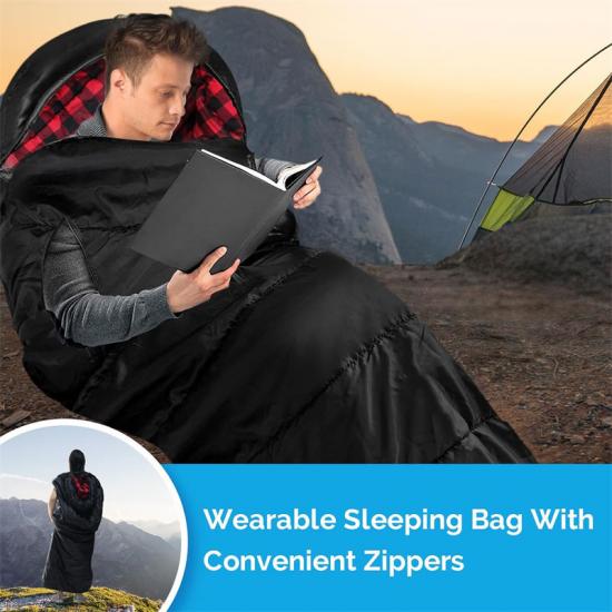 Der (79+12)*32 Zoll/(200+30)*81 cm große Polyester-Schlafsack hat eine angenehme Temperatur von 12–16 °C, damit Sie im Notfall ausreichend Ruhe finden. Dank des Reißverschlusses an der Unterseite können Sie im Schlafsack herumlaufen, ohne ihn zu verlassen. 2 kg. Der Schlafsack wird mit einem Kompressionssack zum einfachen Packen und Tragen geliefert.