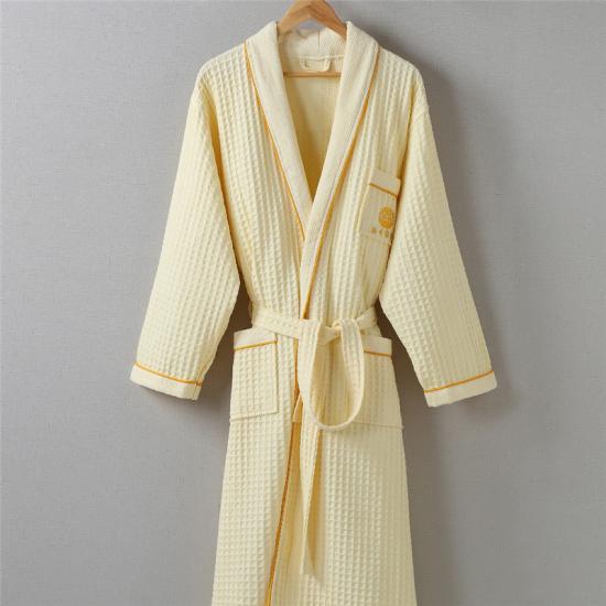 Weicher, gelber, hautfreundlicher Waffel-Bademantel aus reiner Baumwolle mit individuellem Logo für Hotel und Zuhause |