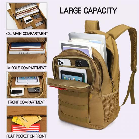 Dieser Rucksack bietet ein großes Fassungsvermögen mit mehreren Fächern für eine übersichtliche Aufbewahrung. Er ist im taktischen Stil gestaltet und bietet einen niedrigen Preis, was ihn zu einer erschwinglichen Option für alle macht, die einen Rucksack mit großem Fassungsvermögen benötigen.