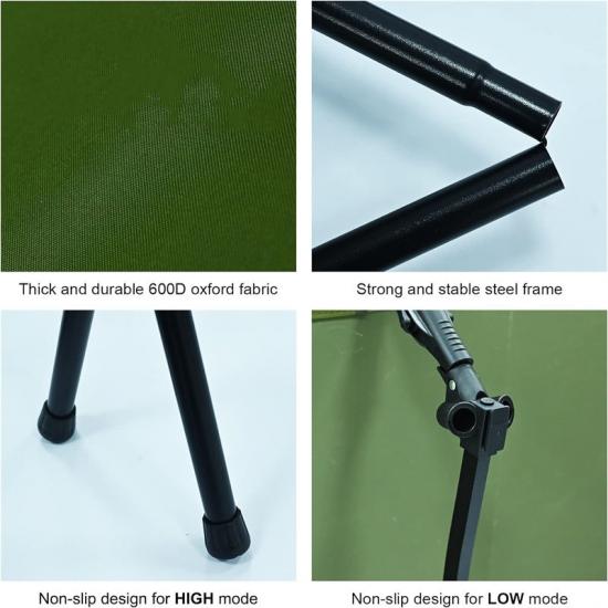 Das tragbare, supergünstige Klappbett „Provide Relief“ verfügt über zwei Höheneinstellungen: 18 cm und 38 cm, um Ihren unterschiedlichen Bedürfnissen gerecht zu werden. Die 18-cm-Höheneinstellung liegt näher am Boden und bietet eine stabilere Liegefläche. Die 38-cm-Höheneinstellung sorgt für bessere Isolierung und Belüftung.
