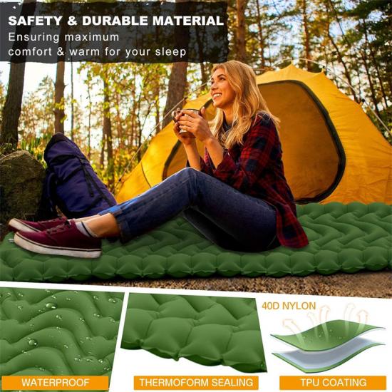 Unsere aufblasbare Isomatte besteht aus dickem 40d-Nylon für Haltbarkeit und moderates Gewicht. Schnelle Entleerung Rettung