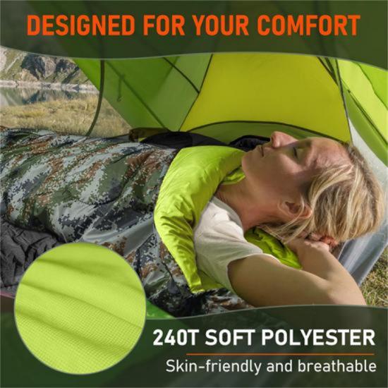 Die isolierte Isomatte besteht aus 3 Zoll dicker Memory-Schaum-Isolierung und Luft. Durch das Öffnen des Ventils kann sich der Schaum ausdehnen und automatisch Luft einsaugen. Die warmen Schlafsäcke von Refugees halten die Luft gut, haben eine schöne Schaumstoffschicht im Inneren und bieten die richtige Unterstützung für Seiten-, Rücken- oder Bauchschläfer. Das 210T-Polyesterfutter des Schlafsacks fühlt sich angenehm an und macht beim Schlafen nur minimale Geräusche. In Szenarien wie Katastrophenhilfe, Notfallrettung, Militär, Landesverteidigung, gespendeter Hilfe, institutionellen Spenden, Projektarbeiten und Vorratshaltung bietet diese Kombination aus warmen Schlafsäcken und Unterlage für den Außenbereich viel Wärme und Komfort.