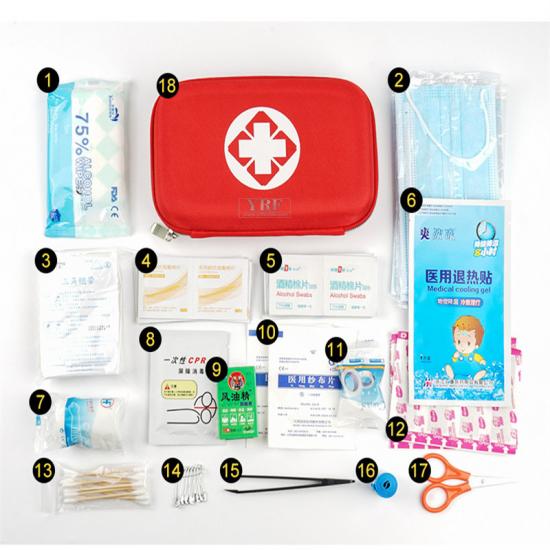 Tücher *10, mFace-Maske *5, Dreiecksverband *1, Jodophor-Wattetabletten *10, Alkoholtabletten *20, Fieberpflaster *1, PBT-Elastikverband *1, CPR-Maske *1, Windöl-Essenz *1, Mullkompresse *2, Klebeband *1, Pflaster *12, Wattestäbchen *1, Sicherheitsnadel *10, Pinzette *1, Tourniquet *1, Schere *1, Erste-Hilfe-Kasten *1